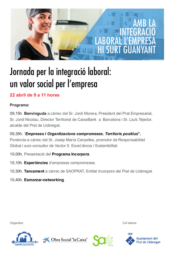 El proper dimecres 22 d’abril de 2015 de 9:15 a 11h, tindrà lloc al Cèntric Espai Cultural (Pl. de Catalunya núm. 39, 08820 del Prat de Llobregat) la jornada “Amb la integració laboral, l’empresa hi surt guanyant”, organitzada per l’associació El Prat Empresarial,...